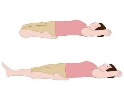 仰向けに寝転んだ状態で片方の膝を曲げて踵とお尻をくっつけ10秒キープしますが、痛い人は座った状態で片足ずつ行いましょう。