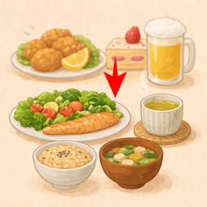 基本的に濃い味よりあっさりしたものを選び、量を減らすよりも脂分を減らす事を意識しましょう。