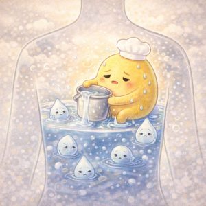 そして脾は消化器系を指し脾が弱い人は水分代謝が悪くなり、腎が弱ると体に水溶性の老廃物が溜まりやすく炎症が起こった際に大量に排出されます。