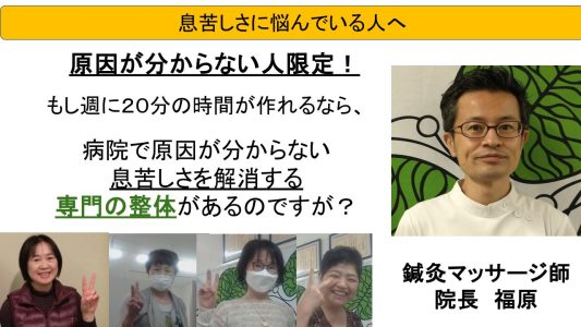 来院された30代女性の方は、数か月前から理由は分からないものの「息がうまく吸えない感じ」が続くようになったとの事です。
